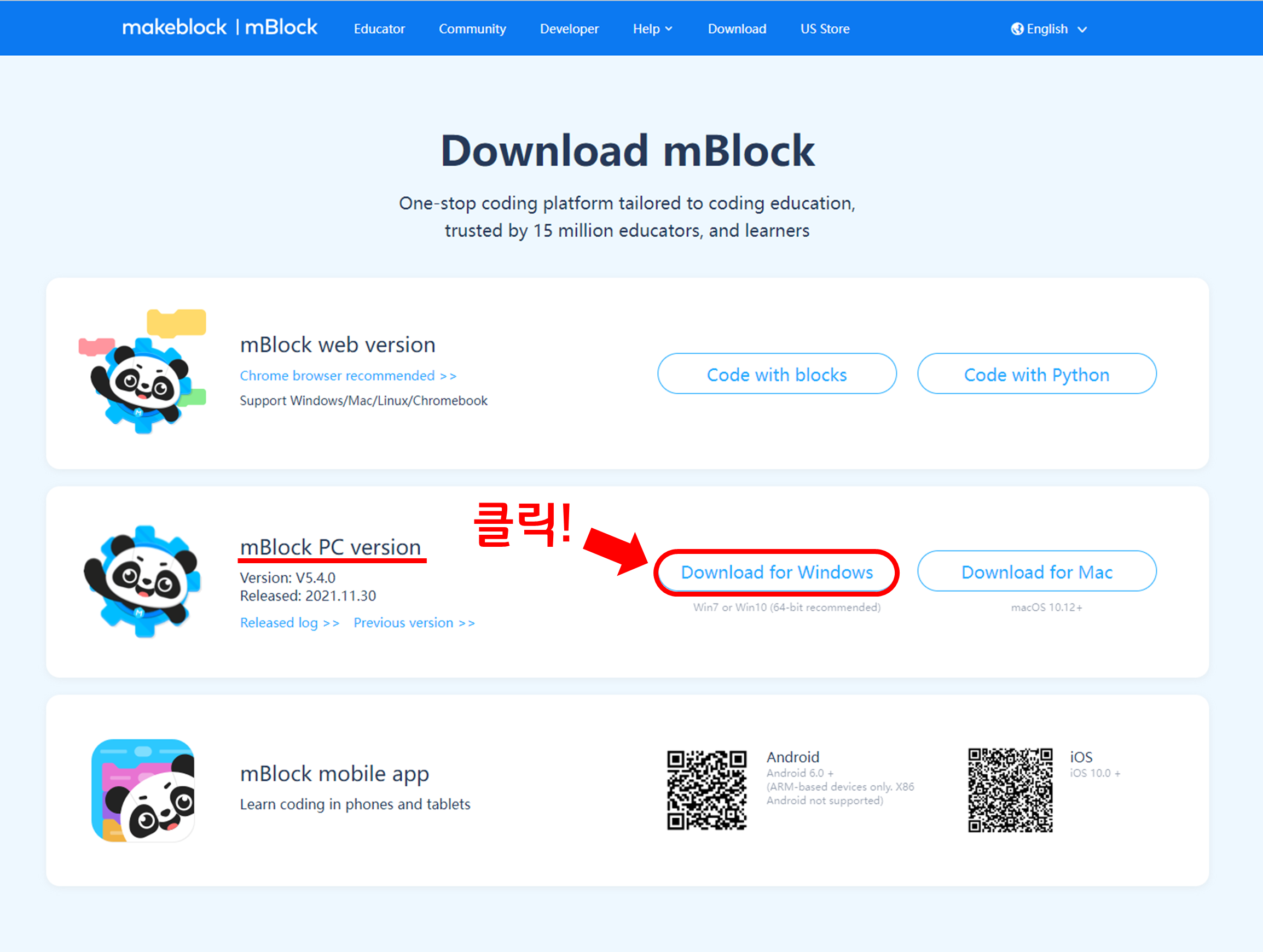 2. Download for Windows를 클릭하여 mBlock 설치파일 다운로드